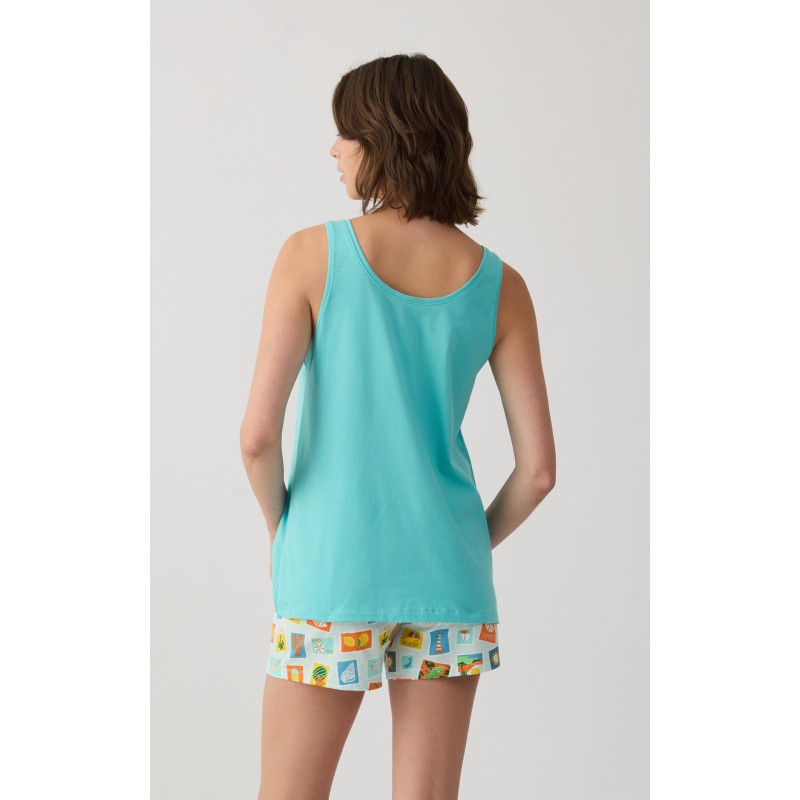 Σετ πυζάμας από 100% βαμβακερό ύφασμα εξαιρετικής ποιότητας που προσφέρει απαλότητα και άνεση όλη τη διάρκεια της νύχτας. Το σετ αποτελείται από αμάνικο τοπ με διακριτικό τύπωμα στο μπροστινό μέρος και κοντό σορτς με all over τύπωμα και λάστιχο στη μέση γΠαραλήπτης :