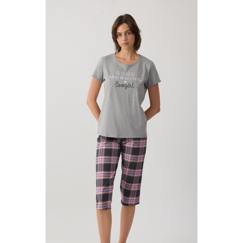 Minerva Rodeo Girl σετ πυτζάμας από μονόχρωμη κοντομάνικη μπλούζα με διακριτικό τύπωμα στο μπροστινό μέρος και εμπριμέ καρό capri παντελόνι με λάστιχο στη μέση για άνετη και σταθερή εφαρμογή.Υφασμα εξαιρετικής ποιότητας 100% βαμβακερό για απαλή αίσθησηΠαραλήπτης :