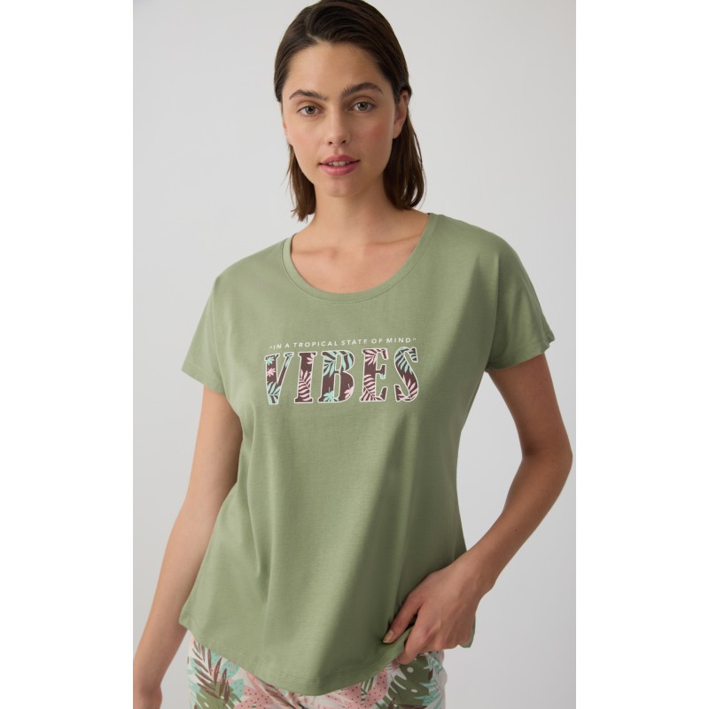 Σετ πυτζάμα Tropical της Μινέρρβα με μονόχρωμη κοντομάνικη μπλούζα με διακοσμητικό τύπωμα στο στήθος και εμπριμέ floral capri παντελόνι με άνετη εφαρμογή.Υφασμα εξαιρετικής ποιότητας απο 100% βαμβάκι για απαλή αίσθηση και άνεση.Παραλήπτης :