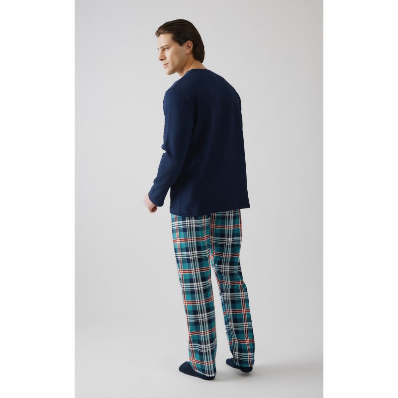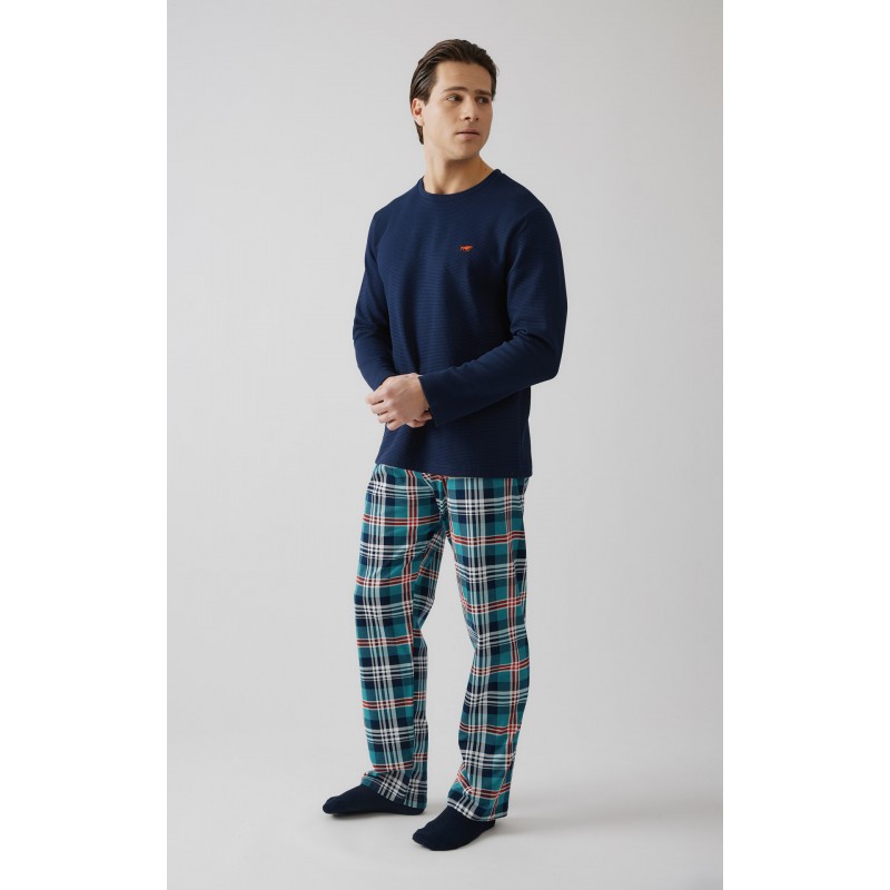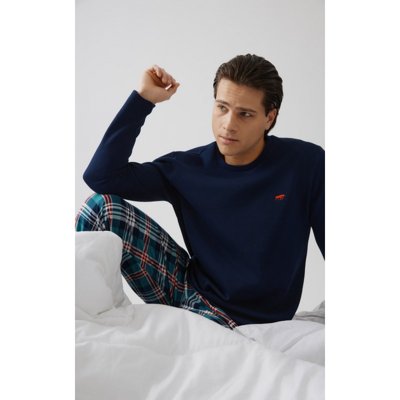 Χειμερινή πυζάμα Waffle της Μινέρβα από 100% βαμβακερό ύφασμα, υψηλής ποιότητας με εφέ γκοφρέ στην μπλούζα, στρογγυλή λαιμόκοψη, μικρό κέντημα στο στήθος και ίσιο τυπωμένο καρό παντελόνι.Παραλήπτης :